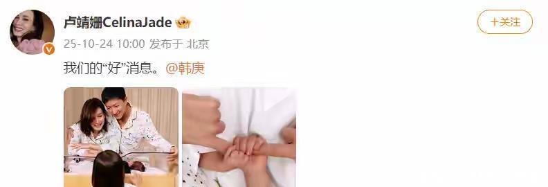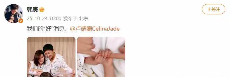 韩庚卢靖姗喜迎二胎,一家四口幸福满溢!10月24日,这对明星夫妇用一张温馨合照官宣喜讯,配文"我们的'好'消息"字字透着甜蜜。